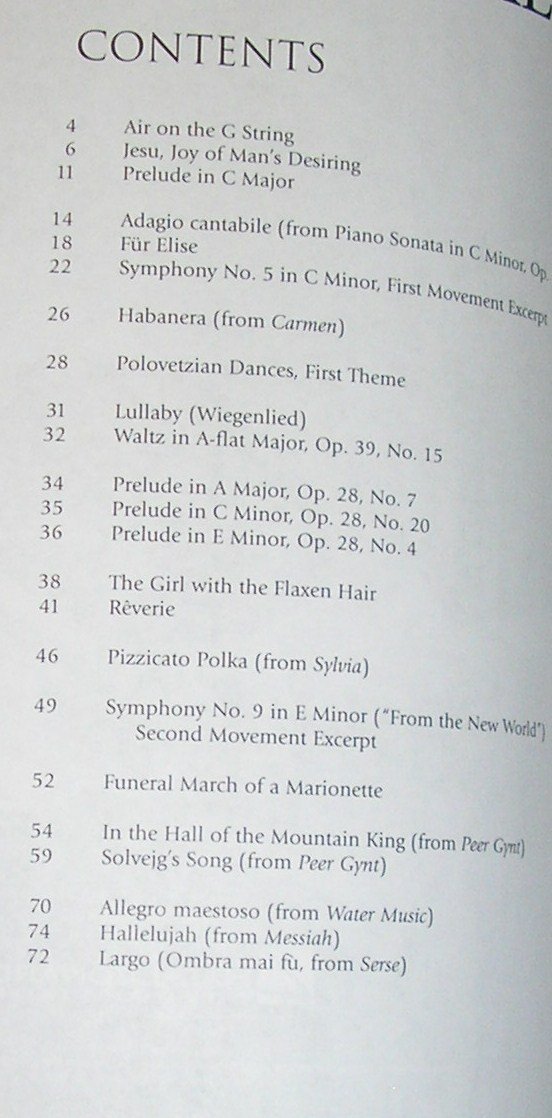 | Classical and New Age Solo Piano Beethoven Famous Masterworks Piano Reduction (5/5 stars). Bach Riemenschneider 371 harmonized Chorales and 69 Chorale Melodies with Figured Bass. (4.7/5 stars). World’s Greatest Melodies for Piano by Maurice Hinson (4.4 stars) Jeanine Yeager Song of the Seasons, Level 4 (New Age Piano) (5/5 stars) Yamaha – 50 Greats For The Piano (4.8/5 stars) Six Sonatinas, By Clementi Op. 36 (4.7/5 stars) Piano Literature for The Intermediate Grades – Volume Three (4.9/5 stars) David Lanz Finding Paradise New age piano (4.7/5 stars) Scriabin — Selected Works (Alfred Masterwork Edition) (4.8/5 stars) | Classical and New Age Solo Piano (continued) The Joy of French Piano Music By Denes Agay (5/5 stars) The World’s Favorite Classical Themes (5/5 stars) MOZART – 12 Variations on Ah, vous dirai-je, Maman,” K. 265″ (4.8/5 stars) The Art Of The Fugue For Solo Keyboard by Johann Sebastian Bach (4.8/5 stars) Liszt Greatest Piano Solos 1972 (5/5 stars) Popular and Jazz Solo Piano The Beatles for Jazz Piano (4.6/5 stars) Scott Joplin Favorites – Arranged by James Bastien (4.5/5 stars) Lee Evans Arranges Jule Styne 5/5 stars 100 of the Most Beautiful Piano Solos Ever (4.5/5 stars) |